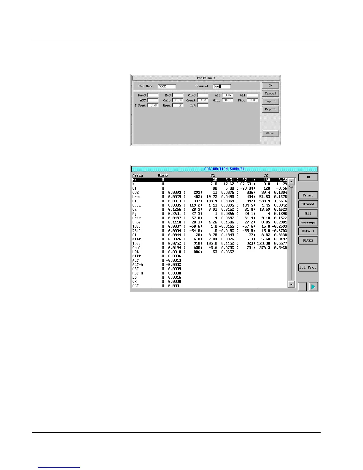 Abbott AEROSET - CALIBRATION SUMMARY Screen; Position Dialog Window