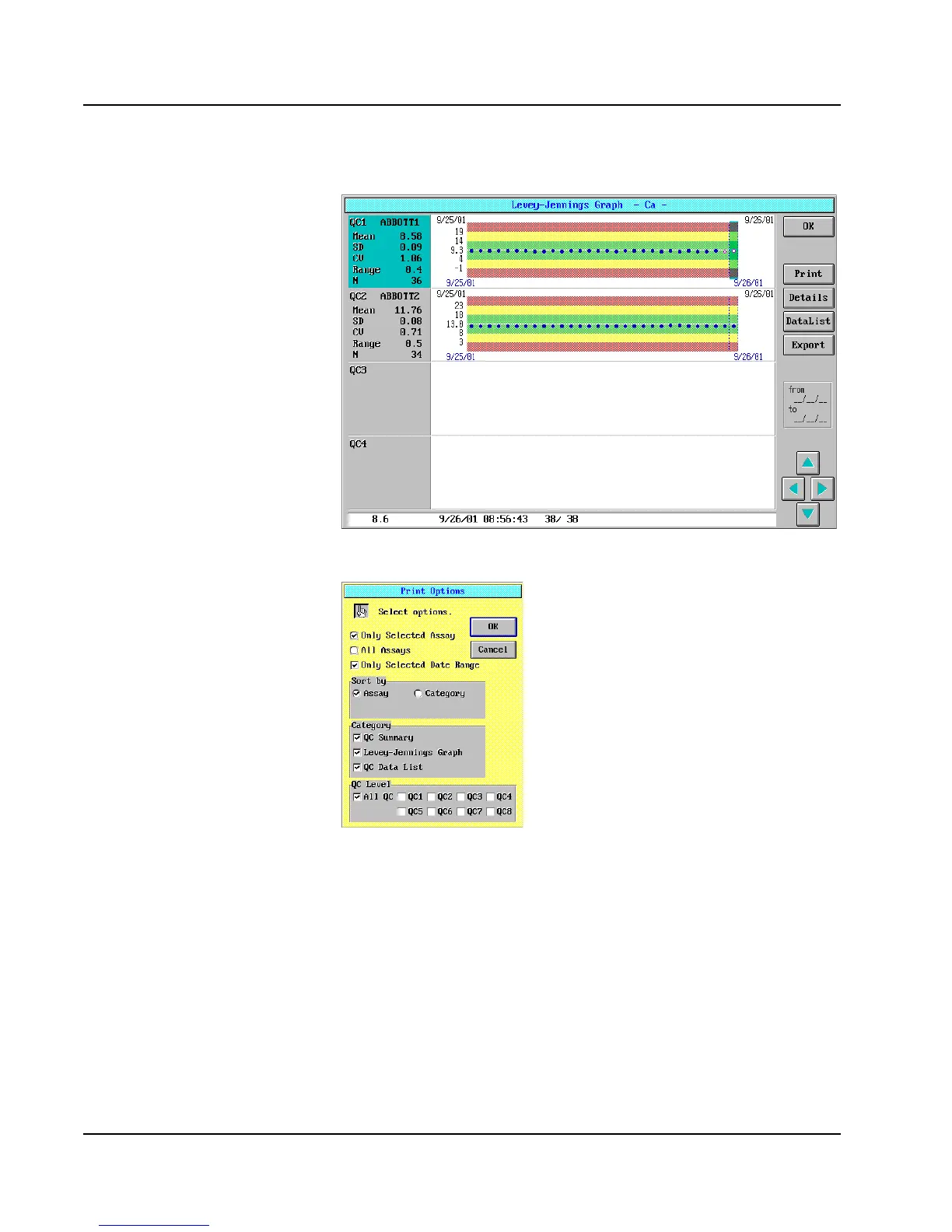 Abbott AEROSET - Levey-Jennings Graph Screen; Print Options (QC) Dialog Window
