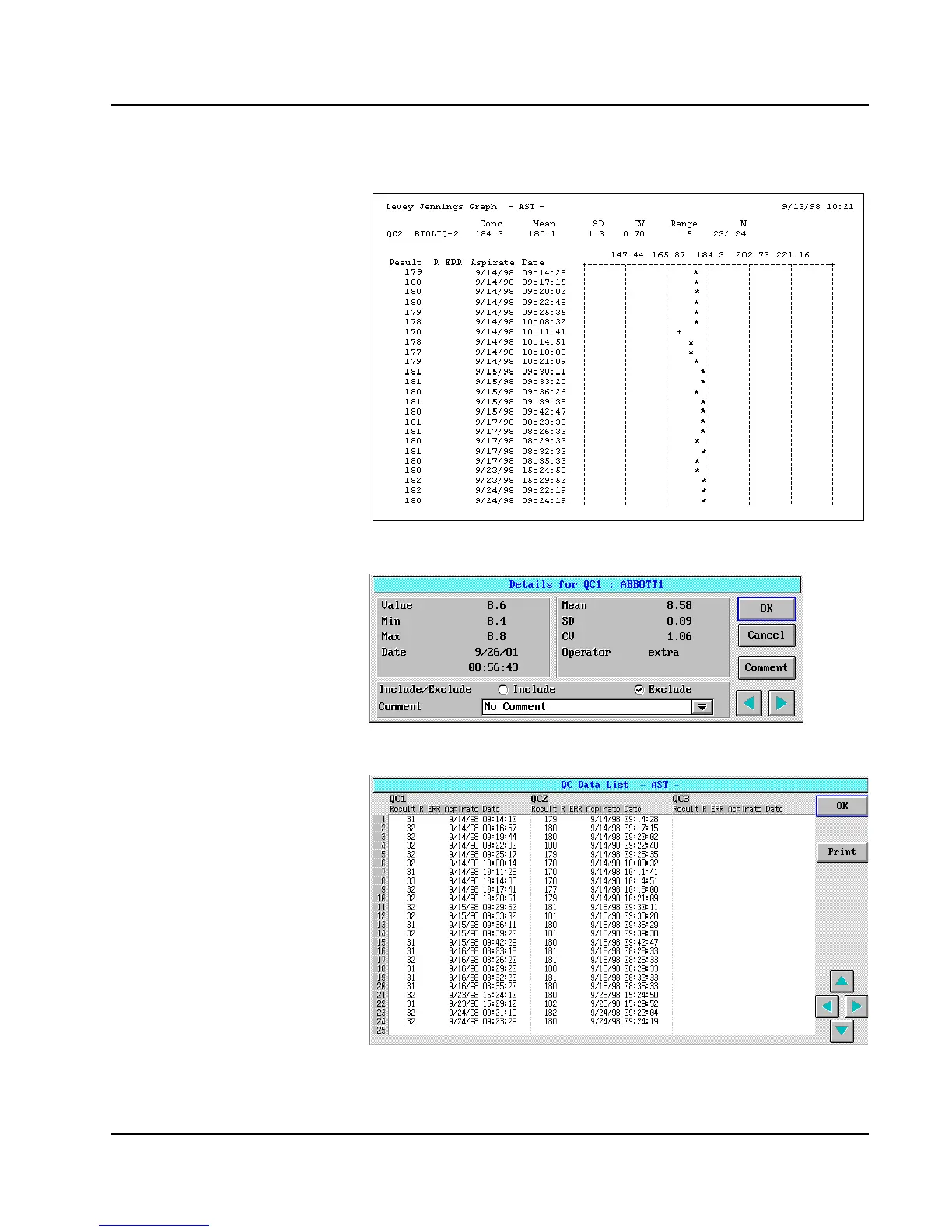 Abbott AEROSET - Levey-Jennings Graph Report; QC Data List Screen; QC Details Dialog Window