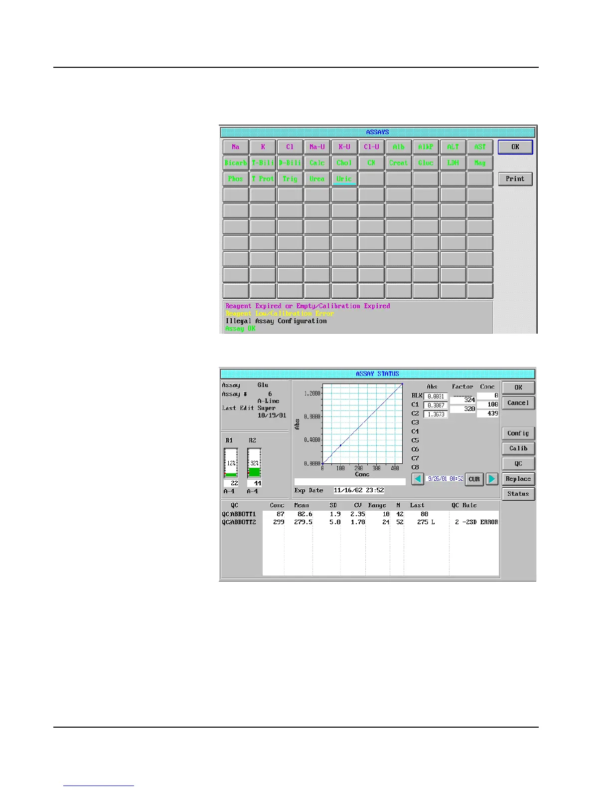 Abbott AEROSET - ASSAY STATUS Screen; ASSAYS Screen