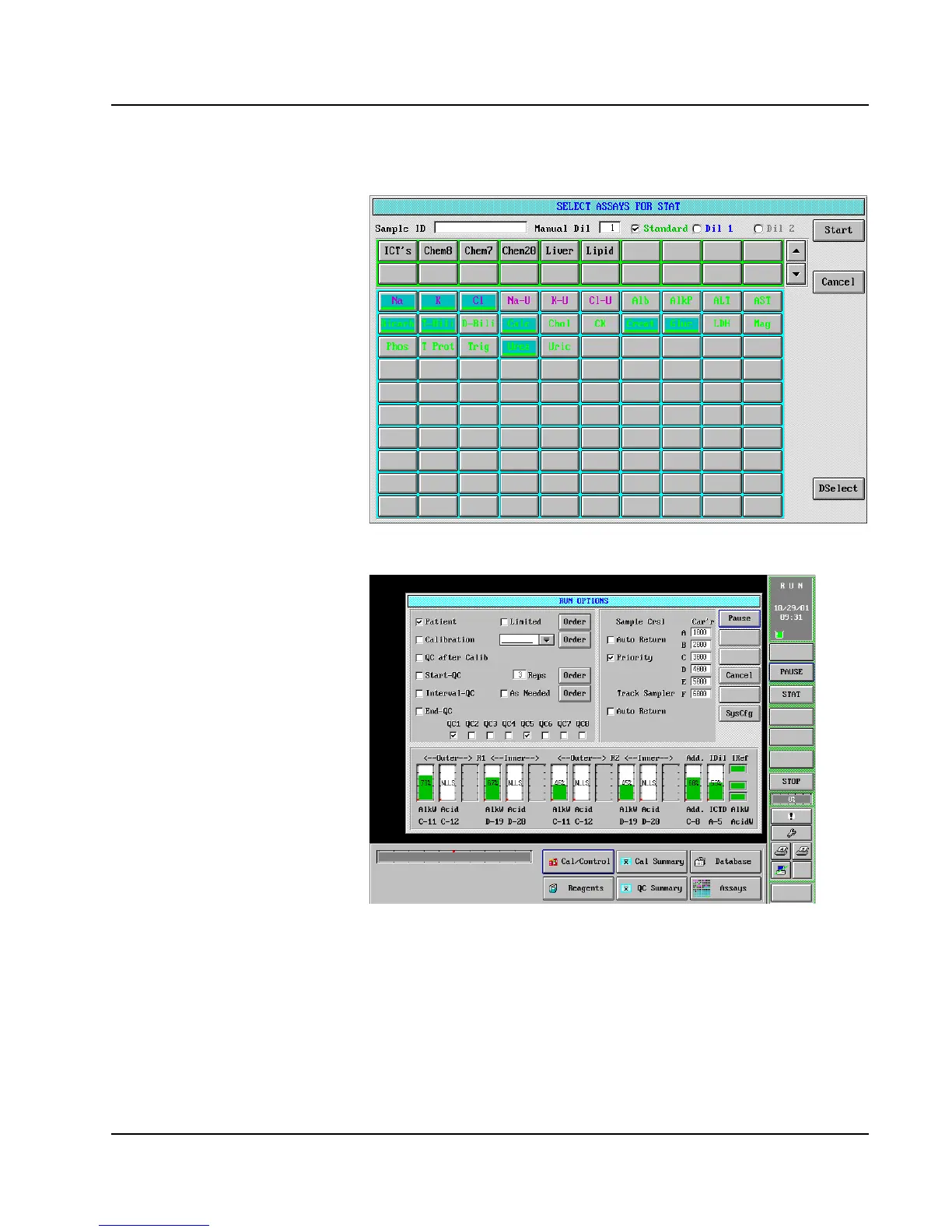 Abbott AEROSET - Pause Function; SELECT ASSAYS for STAT Screen