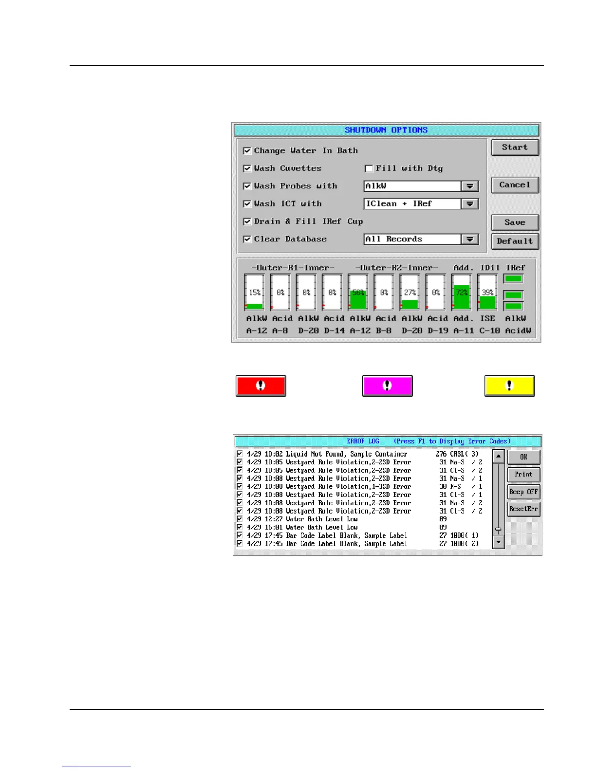 Abbott AEROSET - ERROR LOG Screen; SHUTDOWN OPTIONS Screen