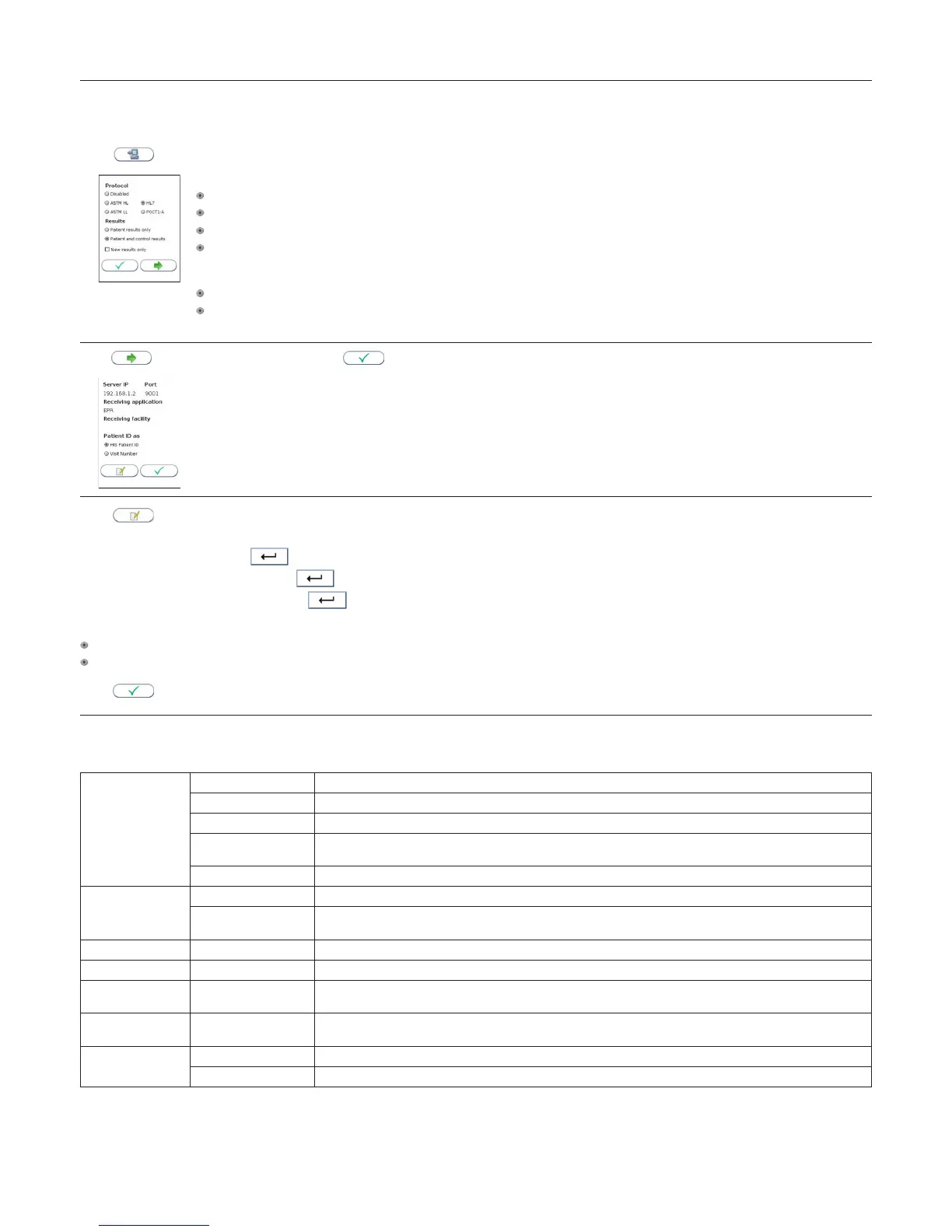 Touch to enter Server IP and Port number, Receiving application (available for ASTM HL, ASTM LL and HL7 only) and Receiving facility (available