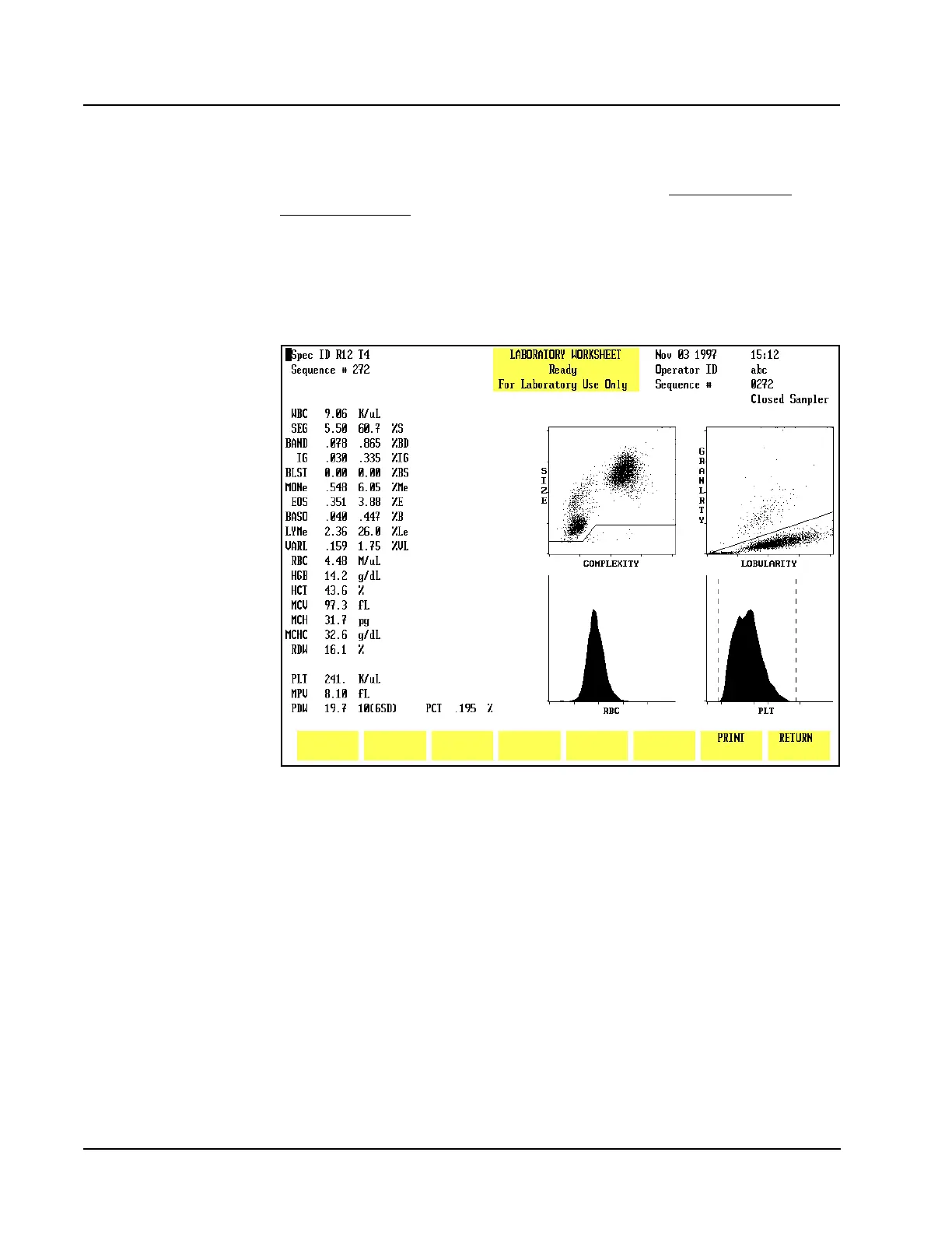 To print the LABORATORY WORKSHEET screen, press the [PRINT] soft key or the