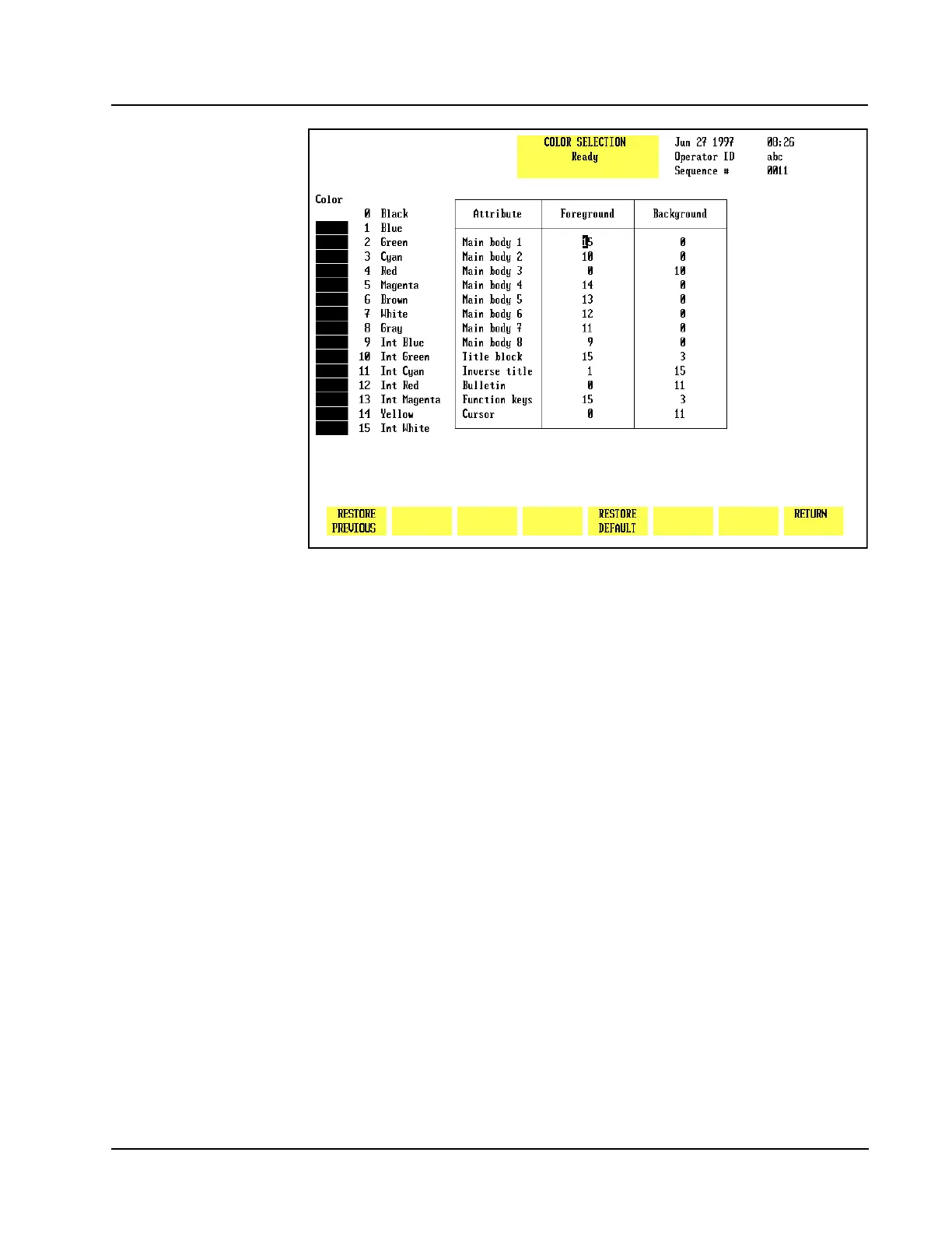 colors for displaying parameter data and other information on the screen. The