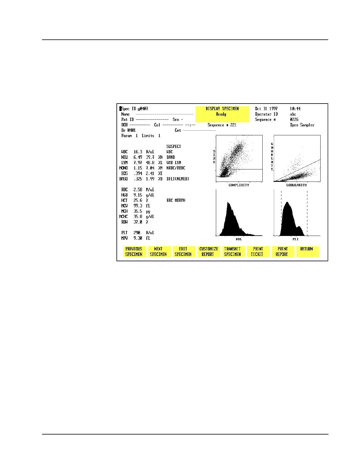 Figure 5.38 Display Specimen Screen Showing Flagging Messages and RBC