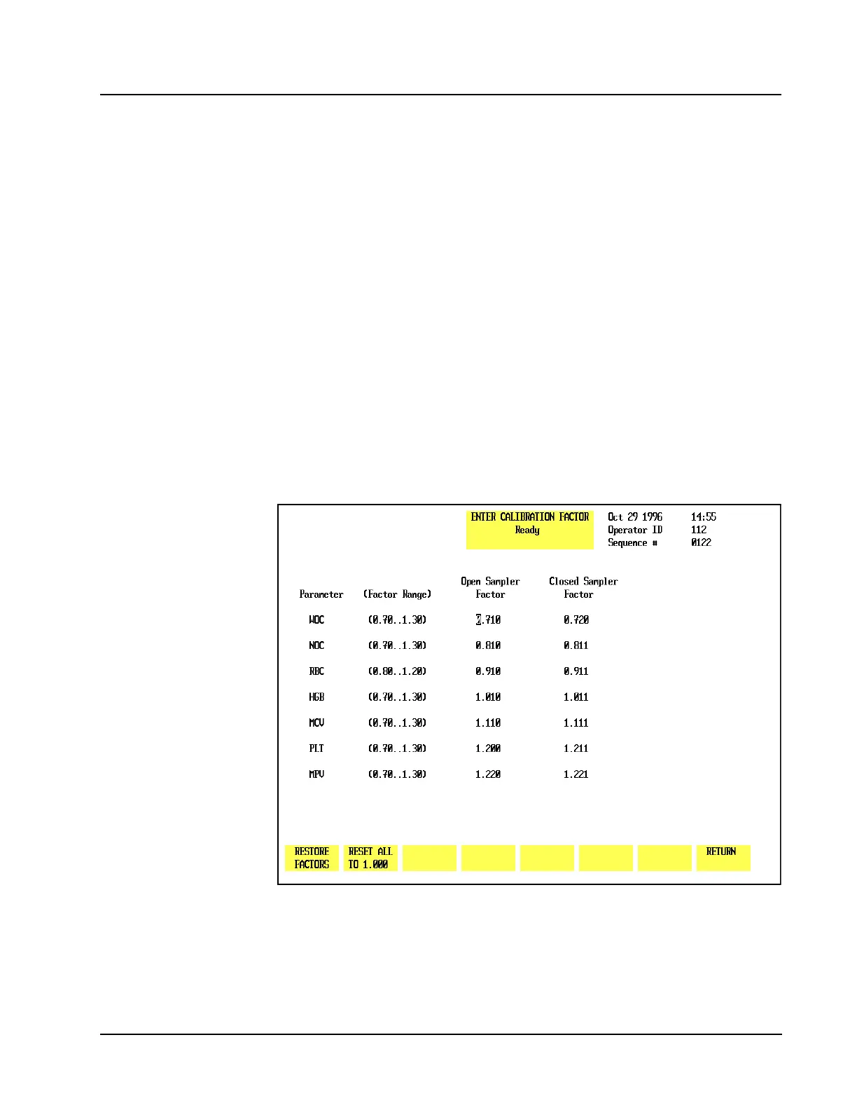 The [RESTORE FACTORS]key is used to restore the previous calibration factors.