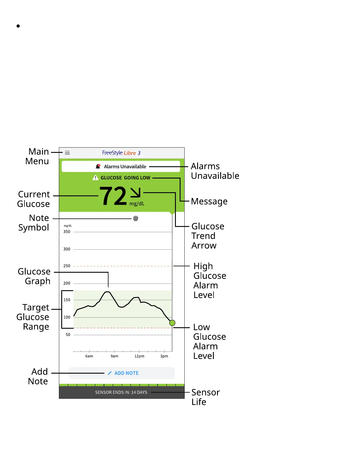 The App Home Screen displays your current glucose, glucose trend arrow, and