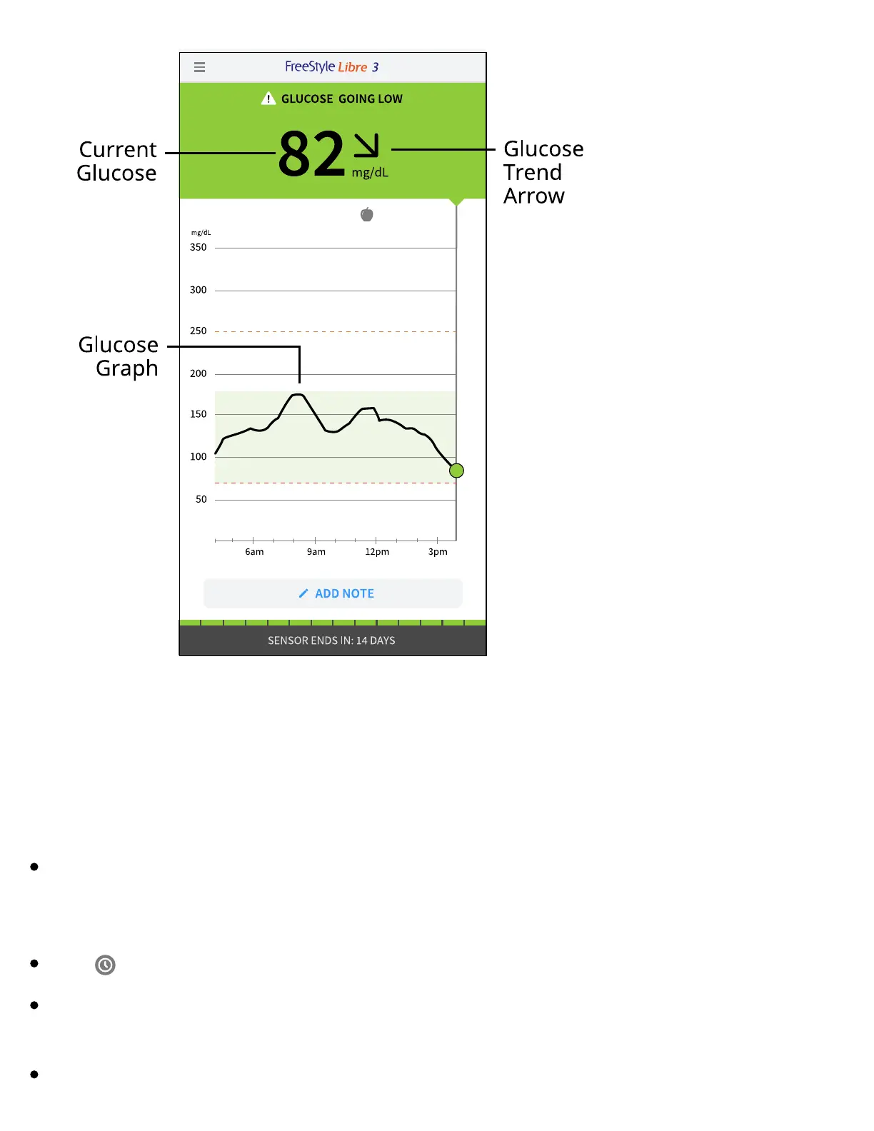The graph displays glucose readings above 350 mg/dL as 350 mg/dL. For