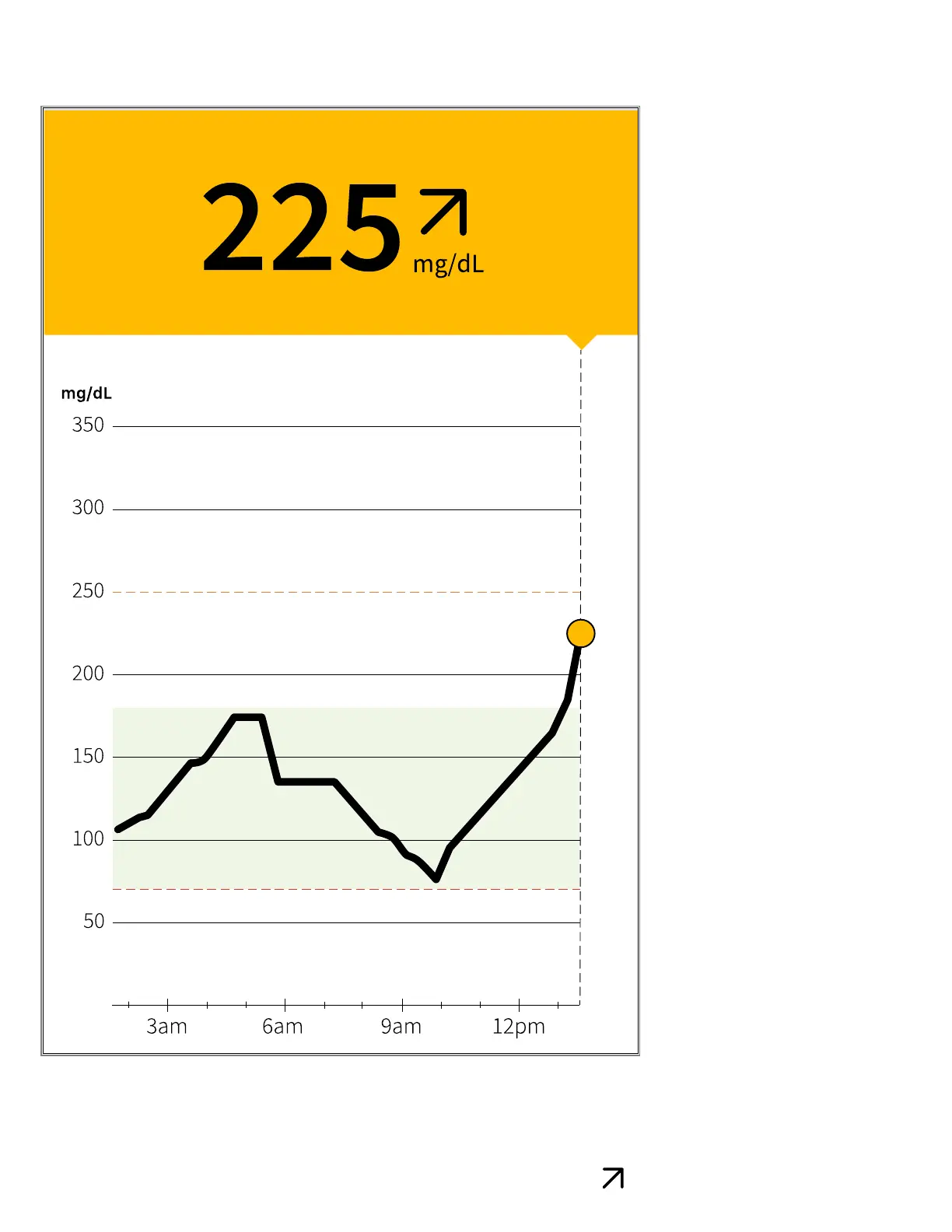 90 minutes later, your current glucose is 225 mg/dL. The graph shows that your