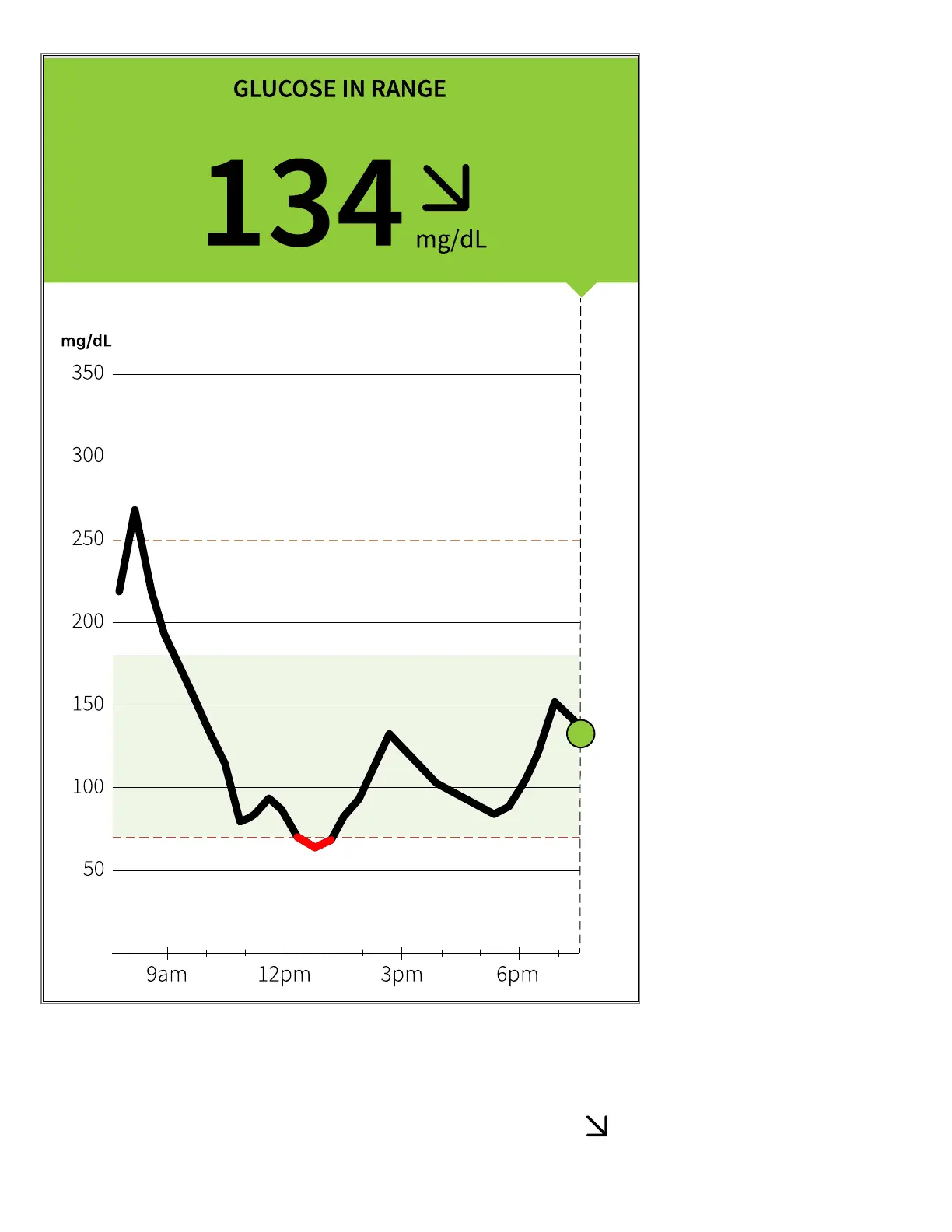 Before dinner, your current glucose is 134 mg/dL. The graph shows that your