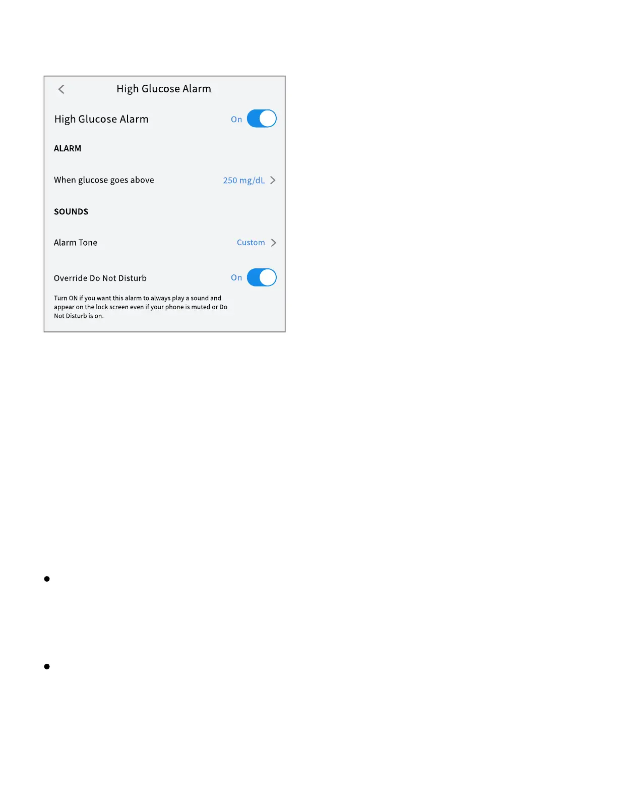 Low, Low or High Glucose Alarms. Tap the slider to turn the alarm off.
