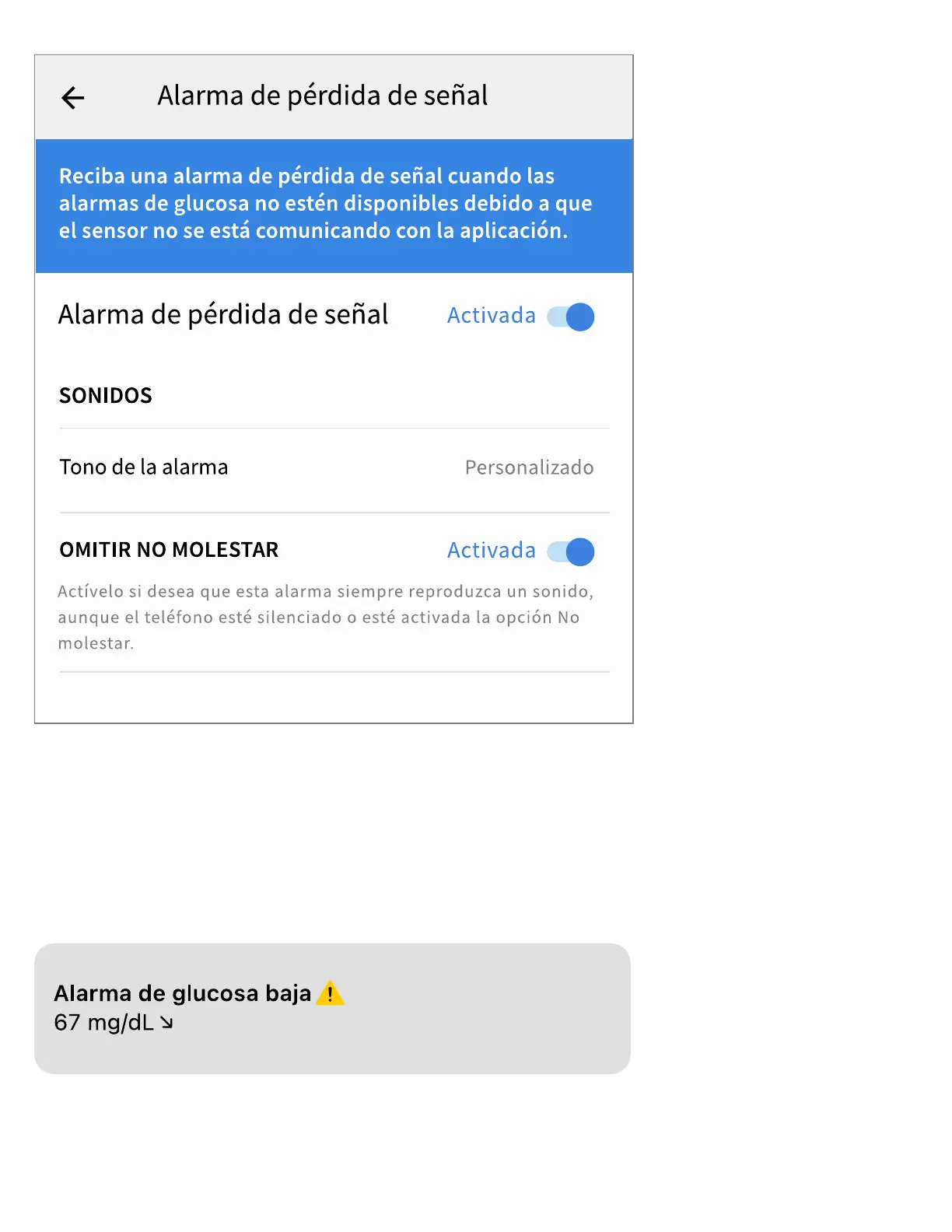 alarma. Solo recibirá una alarma por cada episodio de glucosa baja.