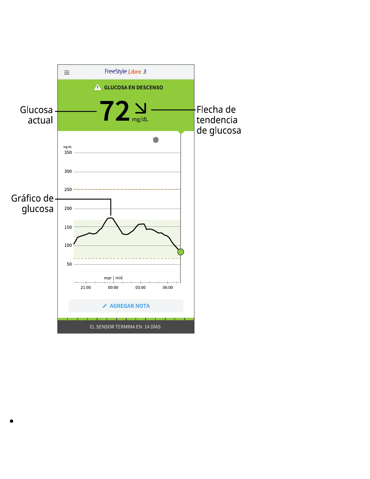350mg/dL. Las lecturas consecutivas que superen los 350mg/dL se mostrarán