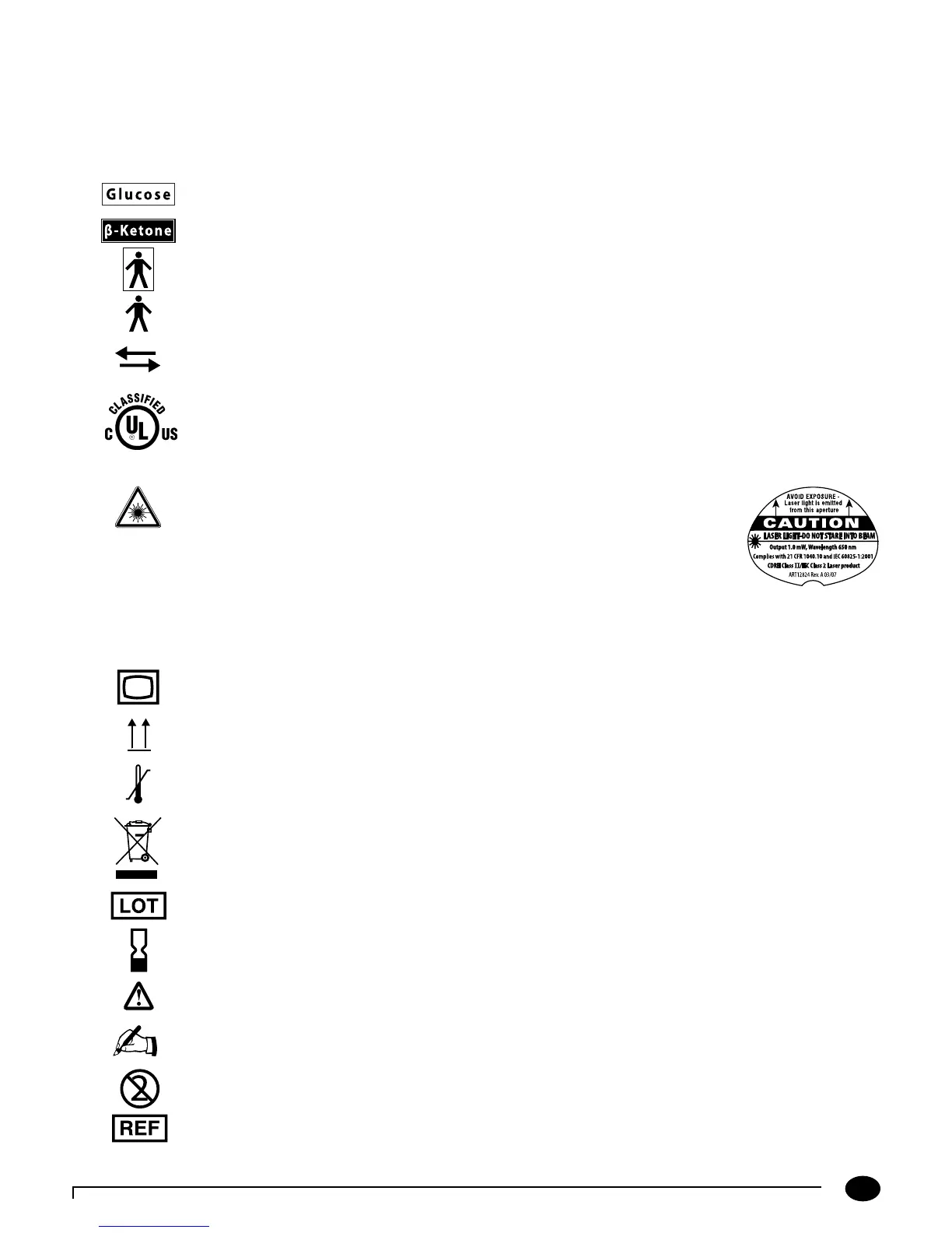 There are special symbols that appear on the Precision Xceed Pro Monitor, Test Strips and Docking Station. The complete list of