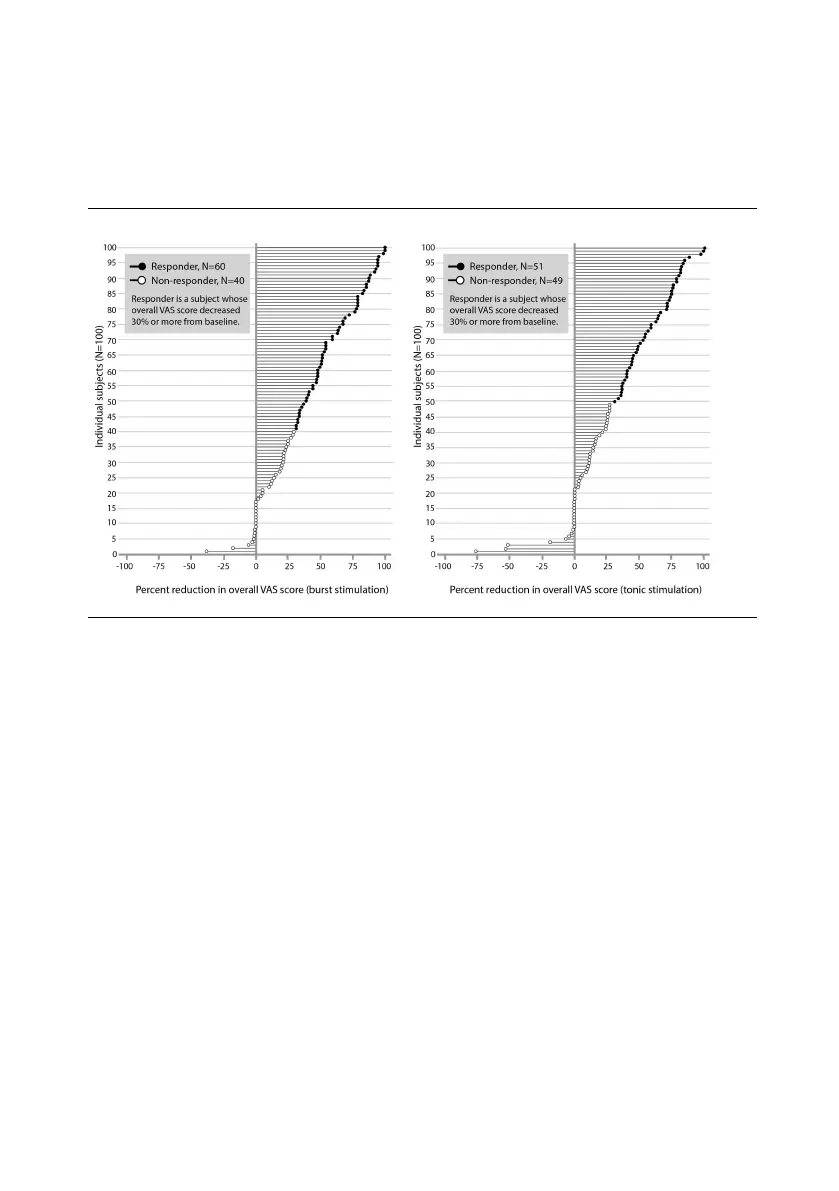 The following figure shows the percentage of pain relief for burst stimulation (left graph) and tonic