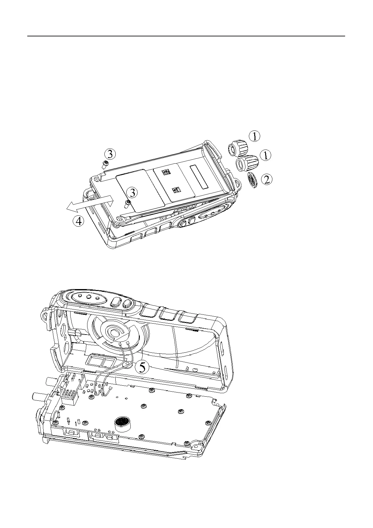 4. Taking care not to cut the speaker lead⑤, open the chassis and case assembly.
