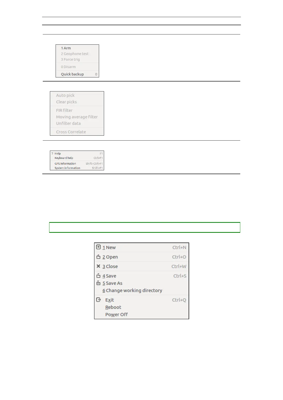 - Geophone test: Starts a geophone test (4.6.7)