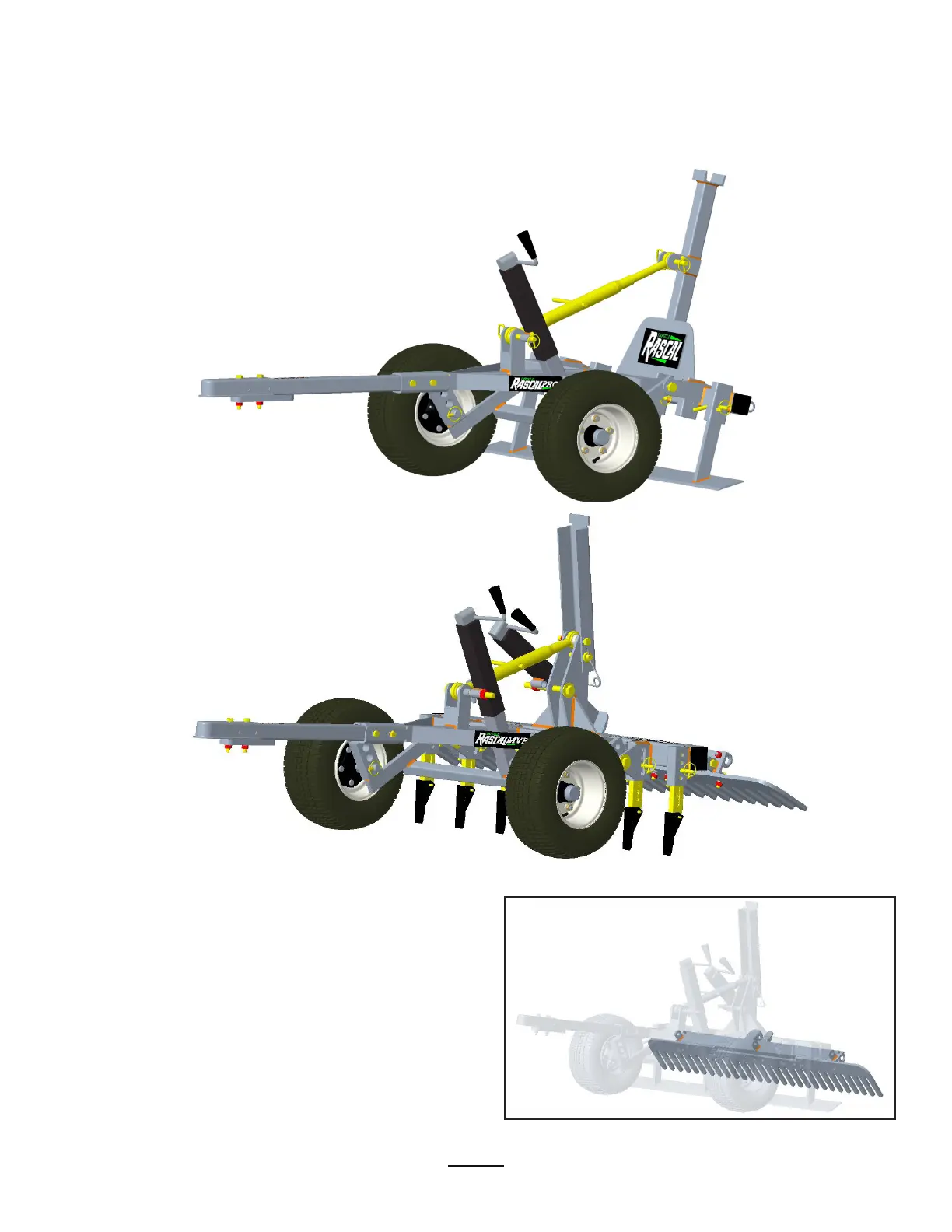 thick hardened-steel-rake, can pivot up to 90° into a variety