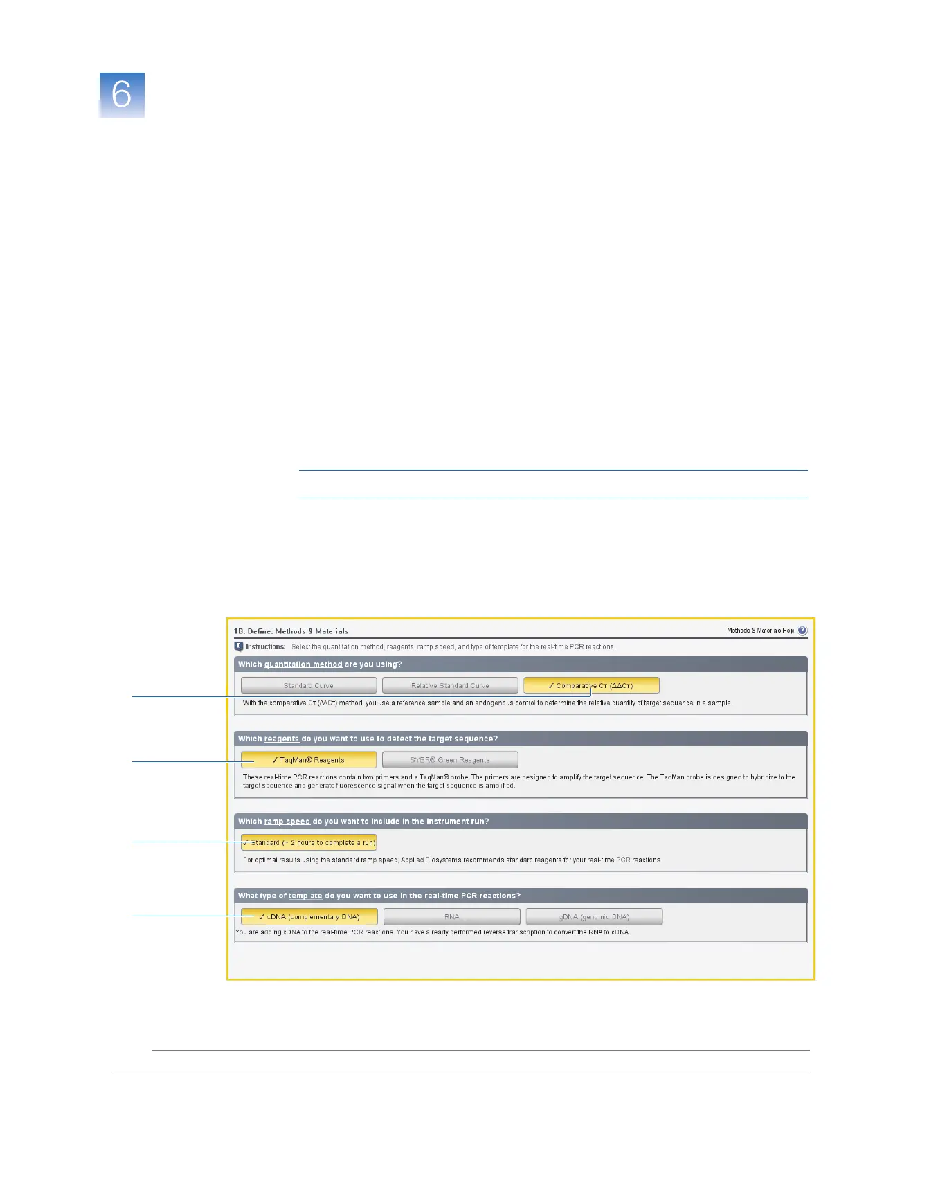 In the Methods and Materials screen, select the quantitation method, reagents, ramp