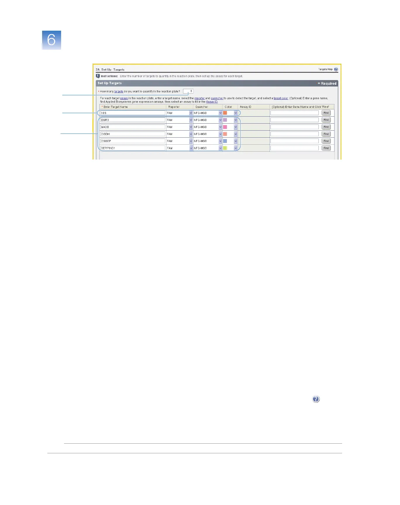• Identify each target assay with a unique name and color. You can enter up to