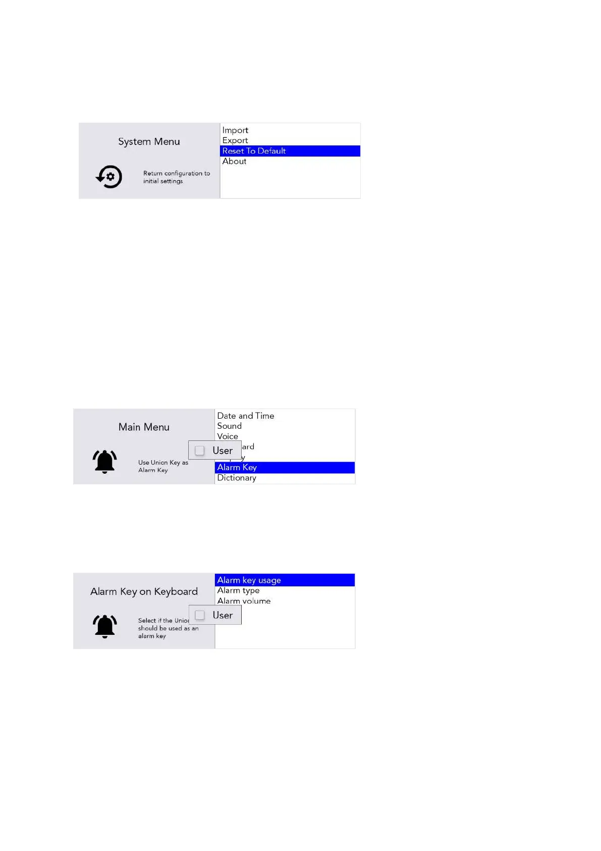 Alarm Key will now appear in the User Menu. However, you will need to repeat the process for any