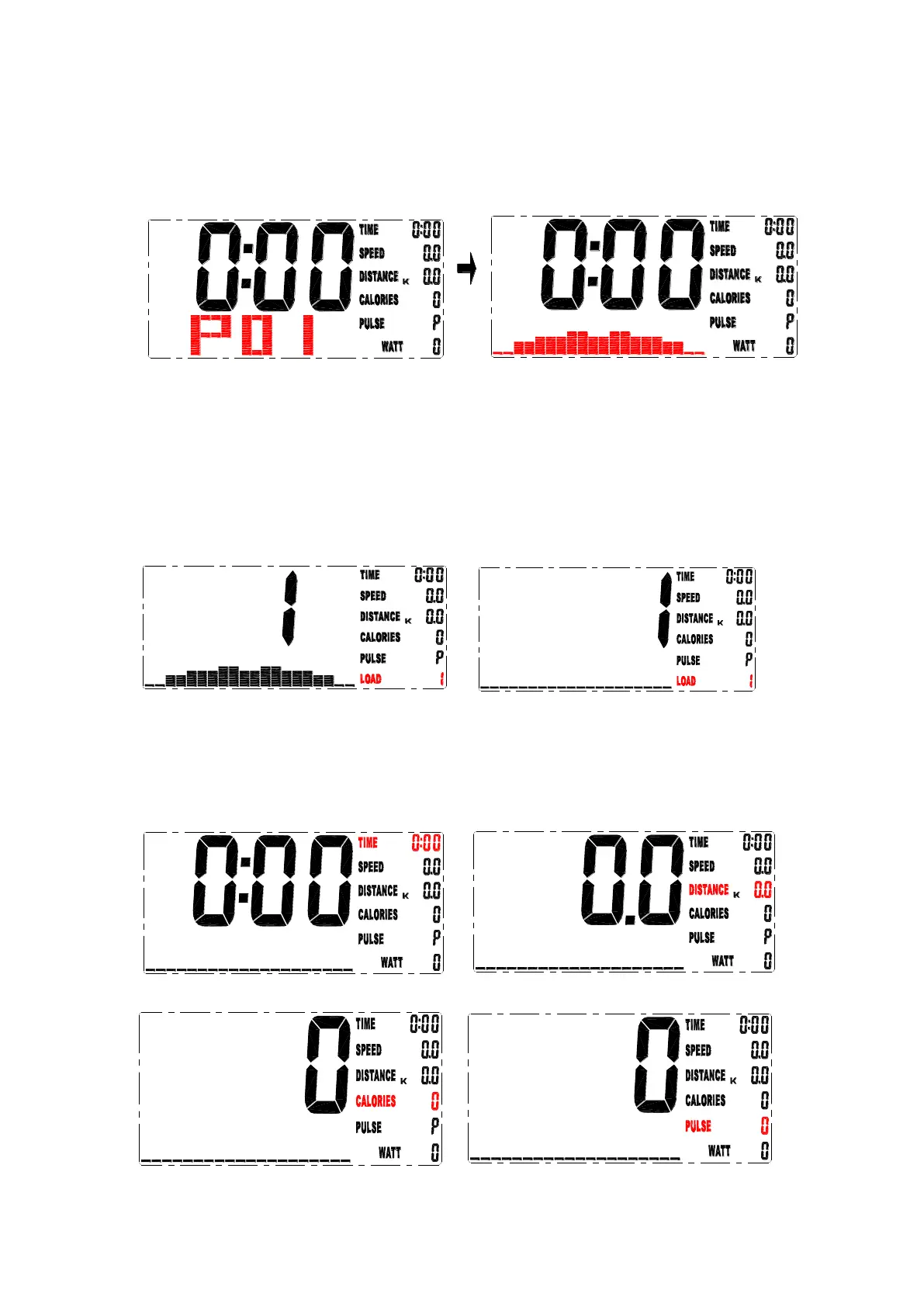 (tid), DISTANCE (sträcka), CALORIES (kalorier) och PULSE (puls) genom att