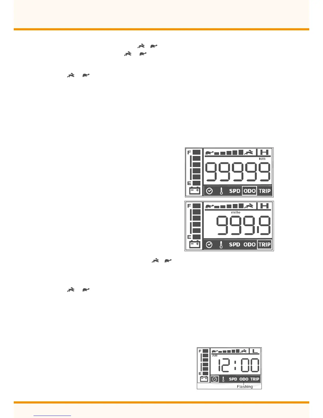 ‘mph’, the odometer displays as mile. ‘/h’, means the odometer is displaying as travel hours.
