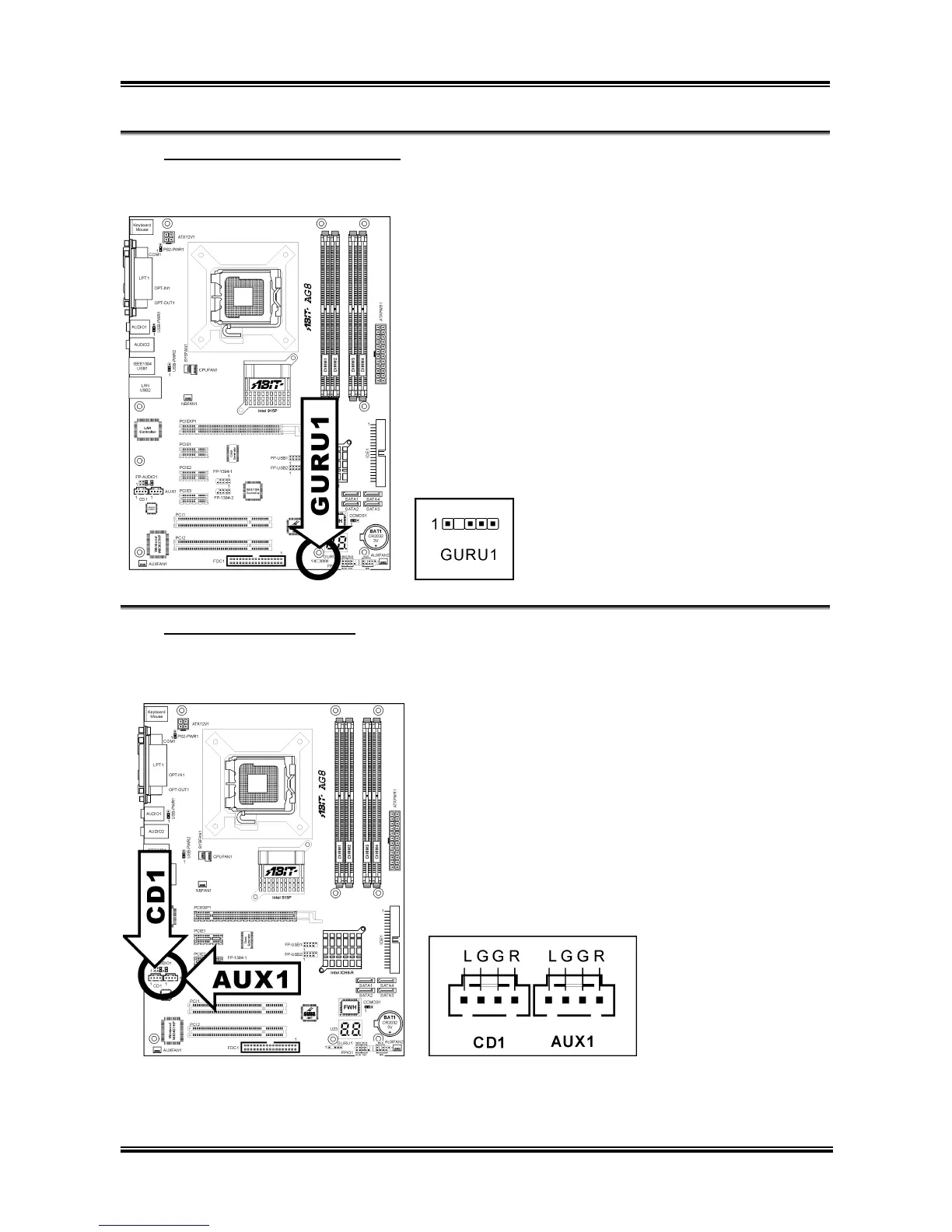 Abit AG8 - GURU Clock Connection Header; Internal Audio Connectors