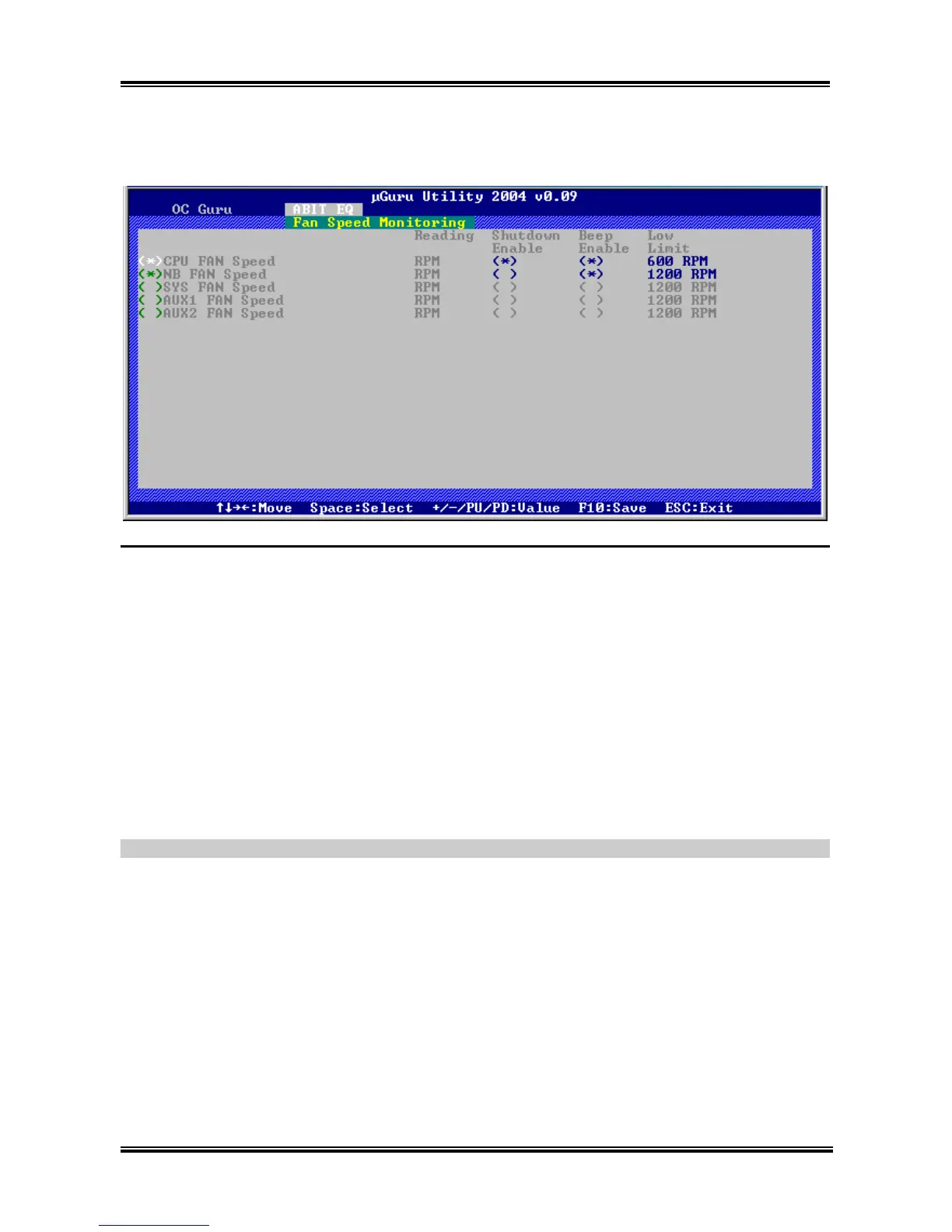 Use <Space> key to enable warning beeps function. If the fan speed is lower than the low limit value,