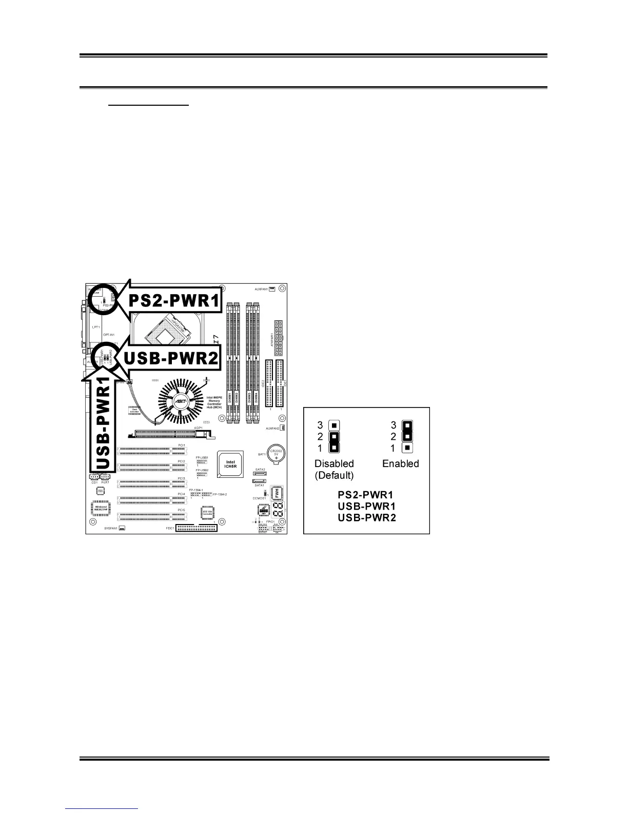 Pin 1-2 shorted (default): Disable wake-up function support at Keyboard/Mouse port.