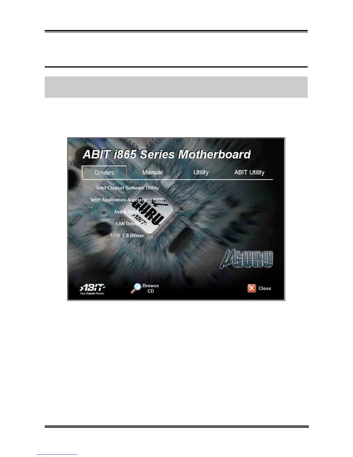 execution file at the main directory of this CD to enter the installation menu. The following screen