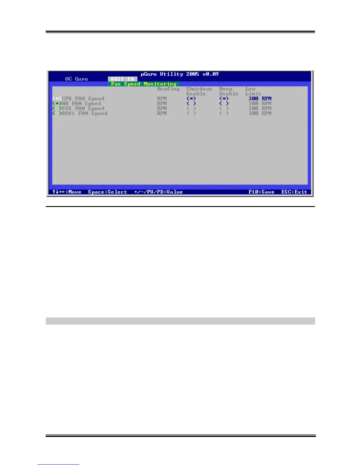 Use <Space> key to enable warning beeps function. If the fan speed is lower than the low limit value,