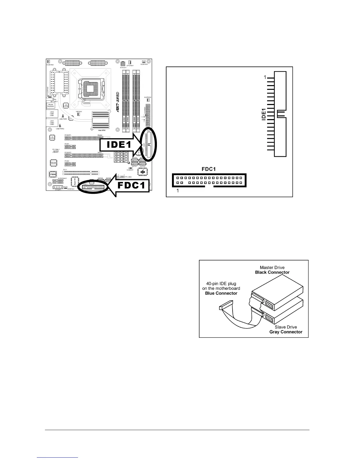 The FDC1 connector connects up to two floppy drives with a 34-wire, 2-connector floppy cable.