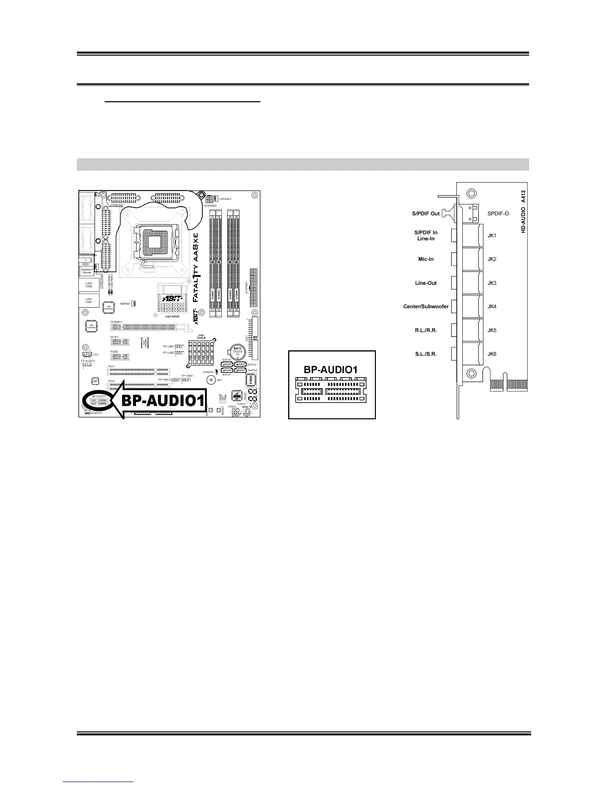 The slot “BP-AUDIO1” provides the audio input/output connection at back panel through an audio