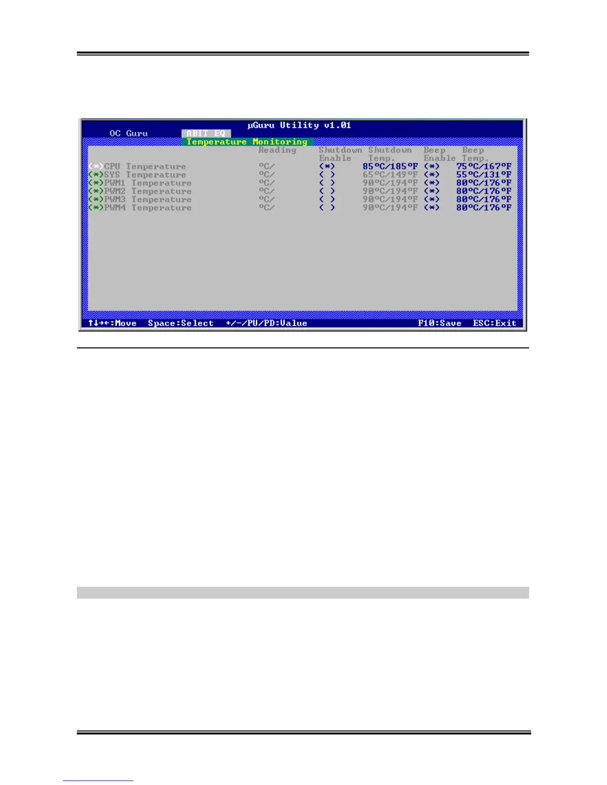 Use <Space> key to enable system shutdown function. If the CPU/System/PWM’s temperature exceeds