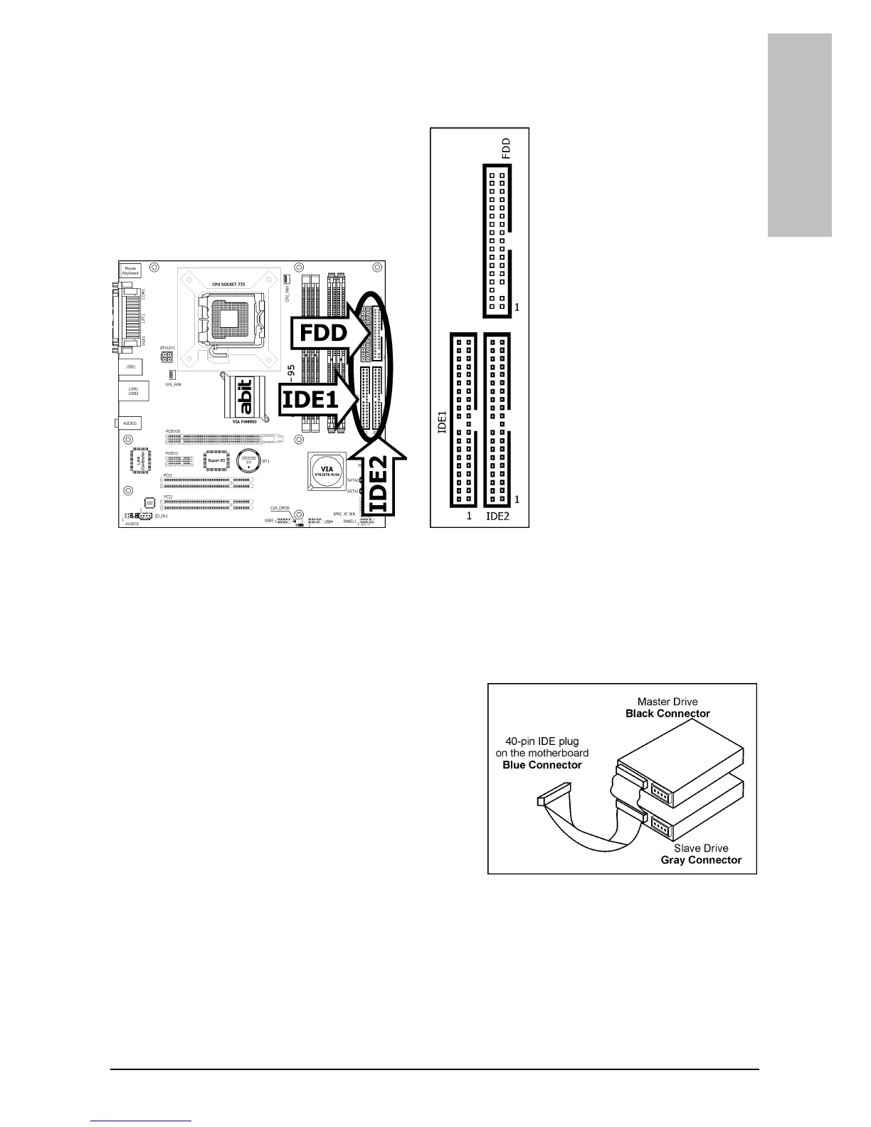 The FDC1 connector connects up to two floppy drives with a 34-wire, 2-connector floppy cable.