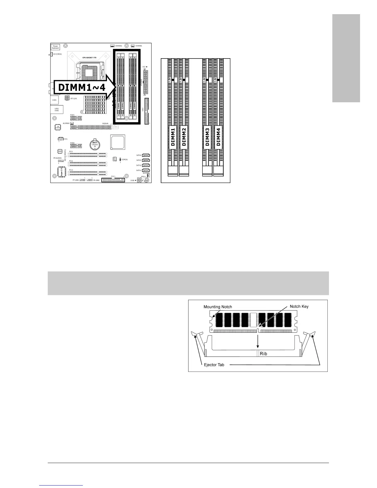 automatically snap into the mounting notch. Do not force the DIMM module in with extra