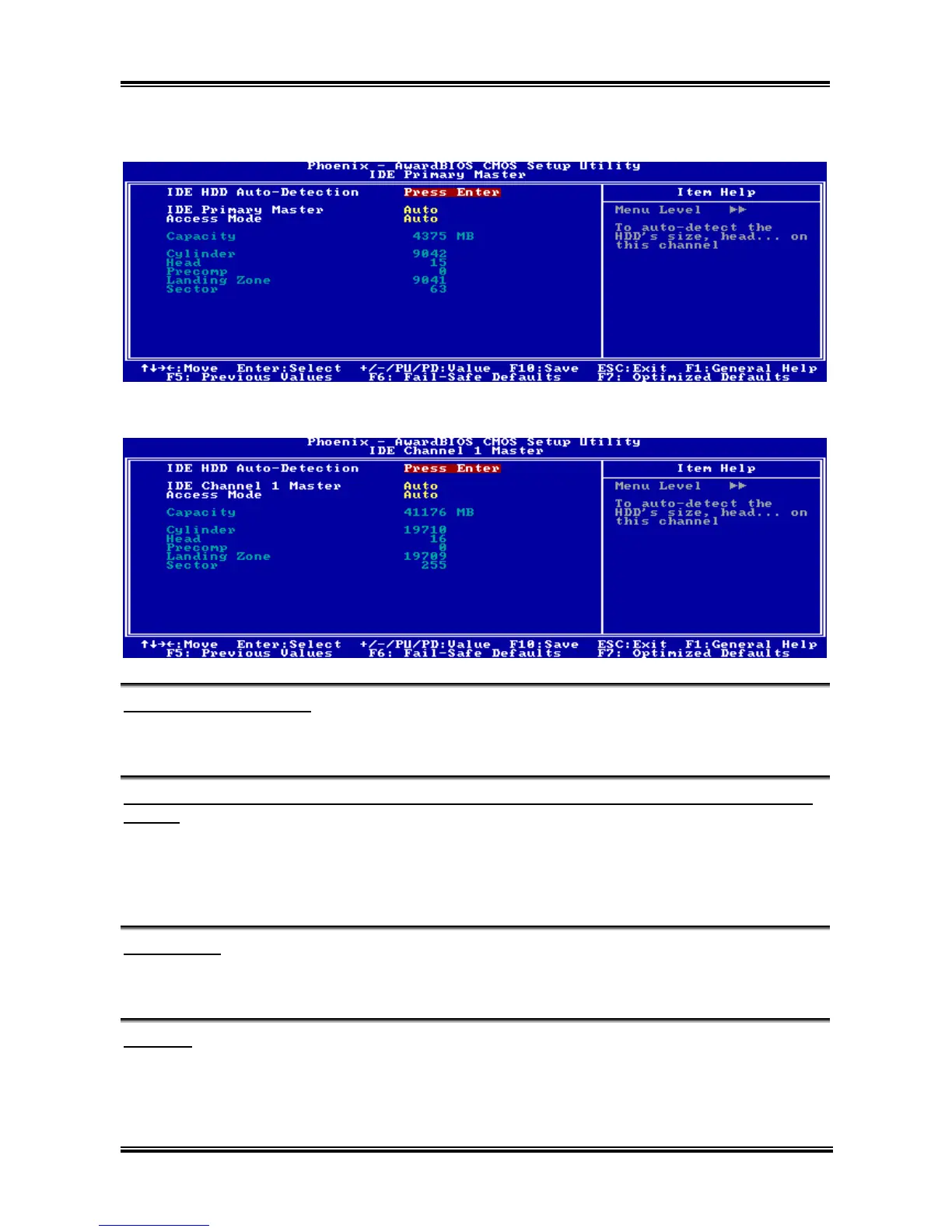 This item allows you to detect the parameters of IDE drives by pressing <Enter> key. The parameters will