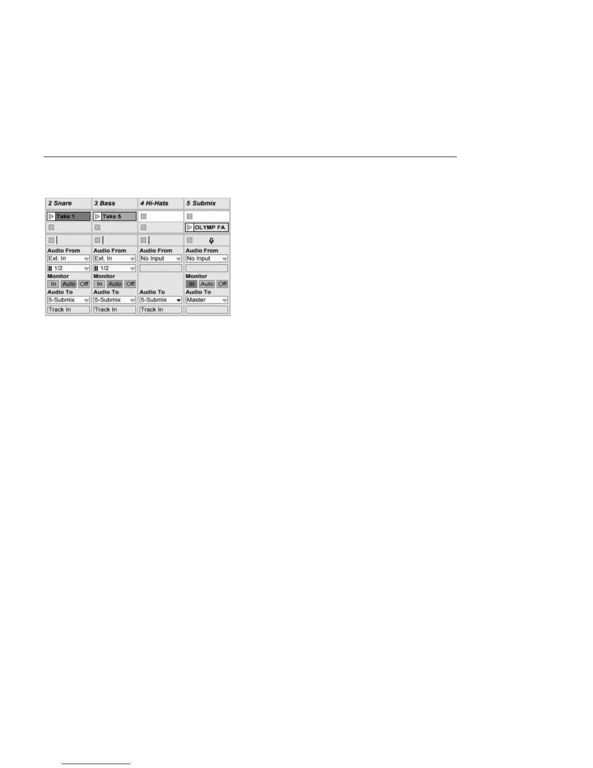 Therefore, we add a new audio track to submix the individual drums. The drum tracks are