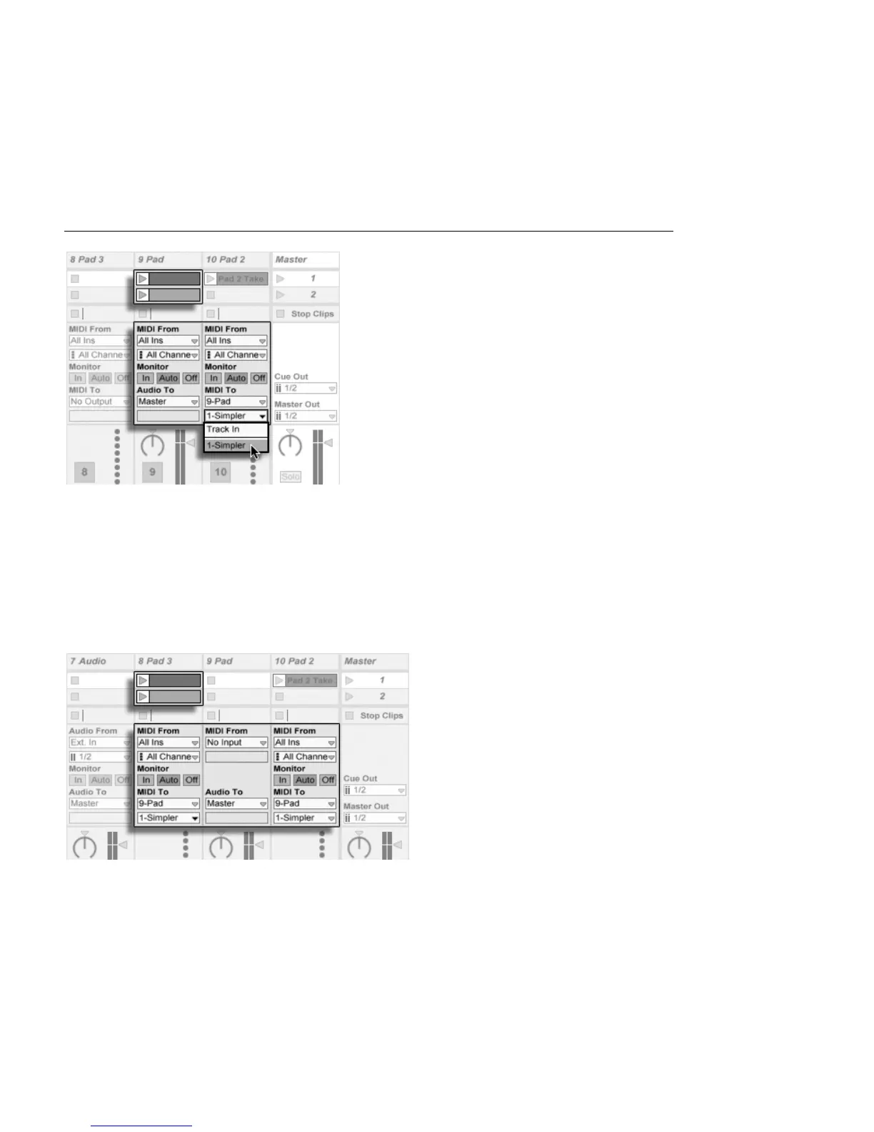 the new track's output into the input of the pad track, or we can directly address the Simpler.