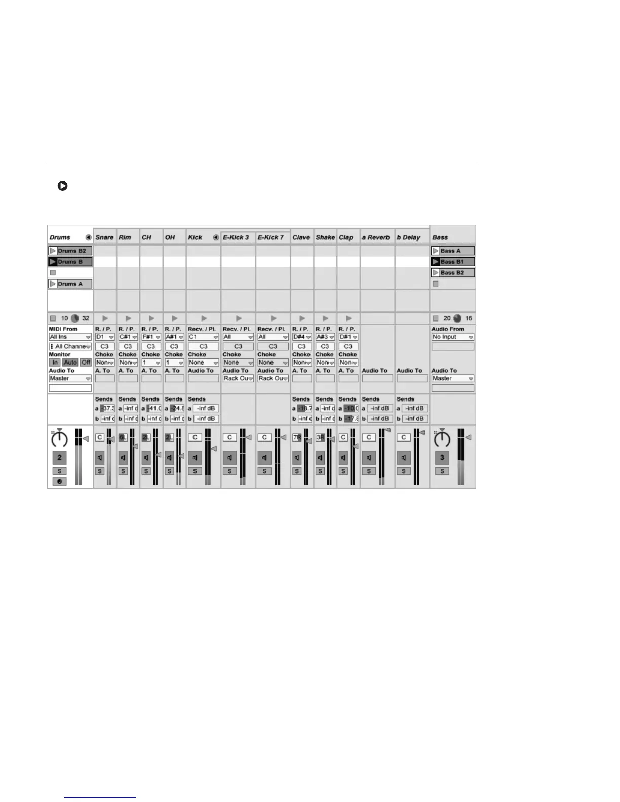 Chains in the Session View mixer look similar to tracks, but they have no clip slots. Their