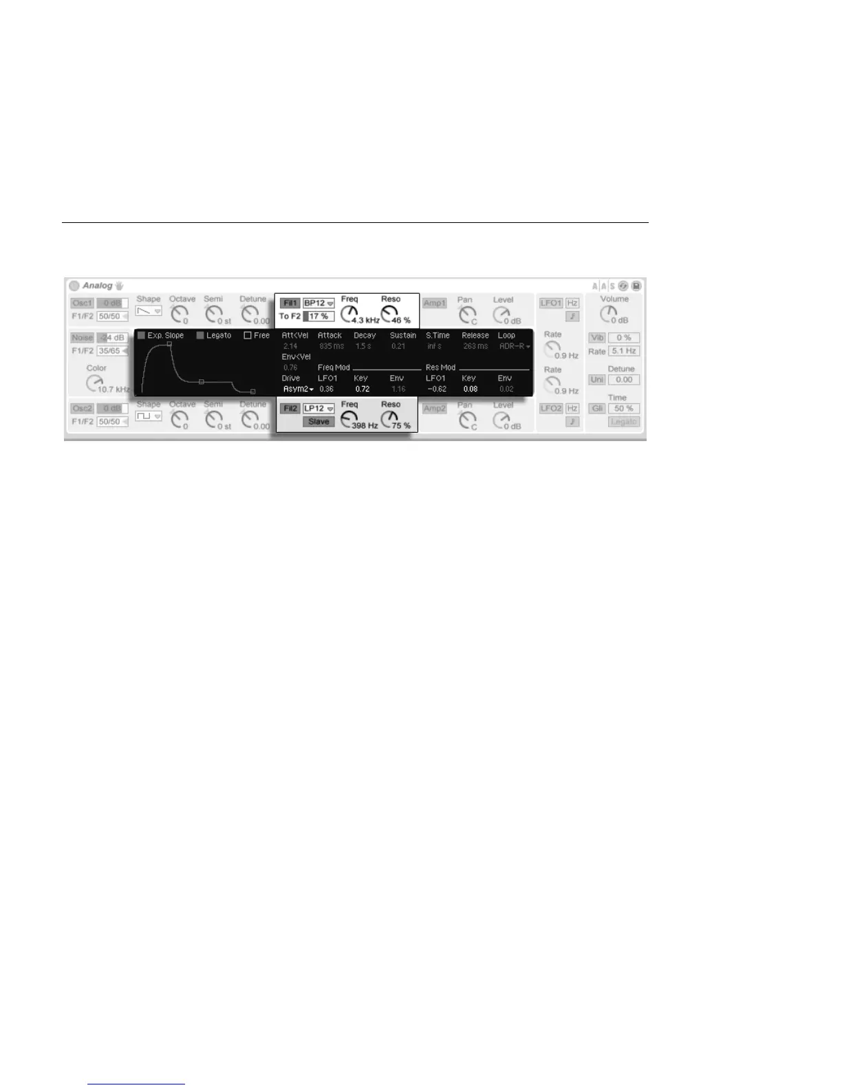 sent to Filter 2. The Slave switch below Filter 2's mode chooser causes this lter's cutoff