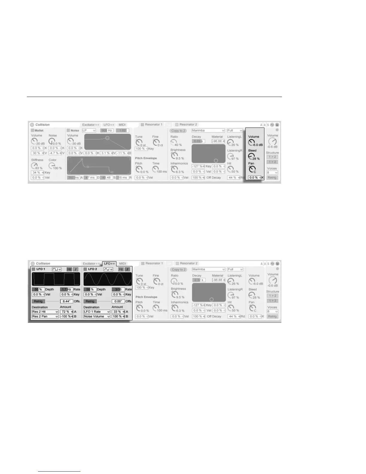 Collision's two independent LFOs can be used as modulation sources for a variety of excitator