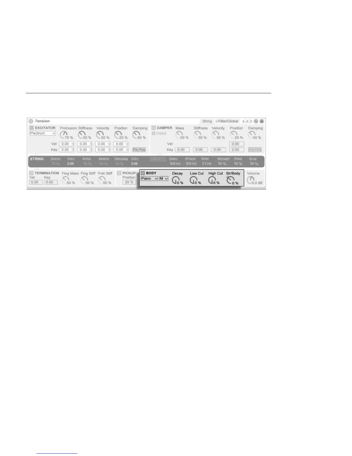 The Str/Body knob adjusts the ratio between the String section's direct output and the signal