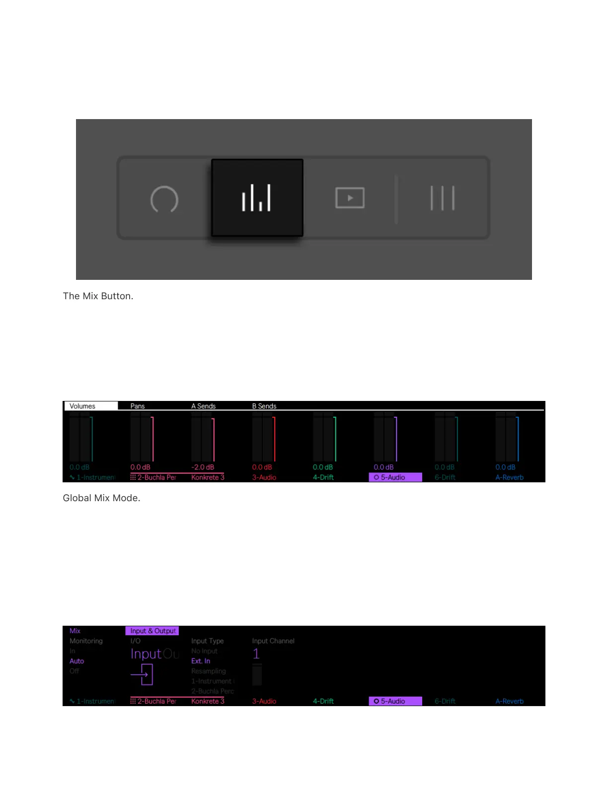 Mix Mode. This shows the volume, pan, and return send settings for