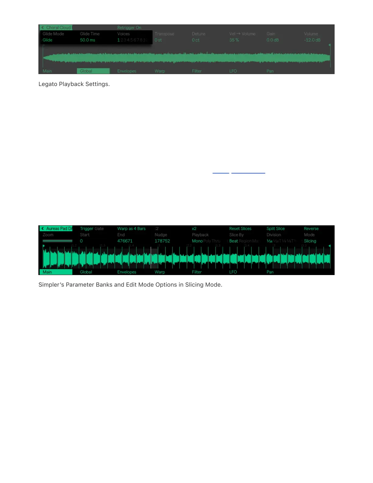 Simpler’s Parameter Banks and Edit Mode Options in Slicing Mode.