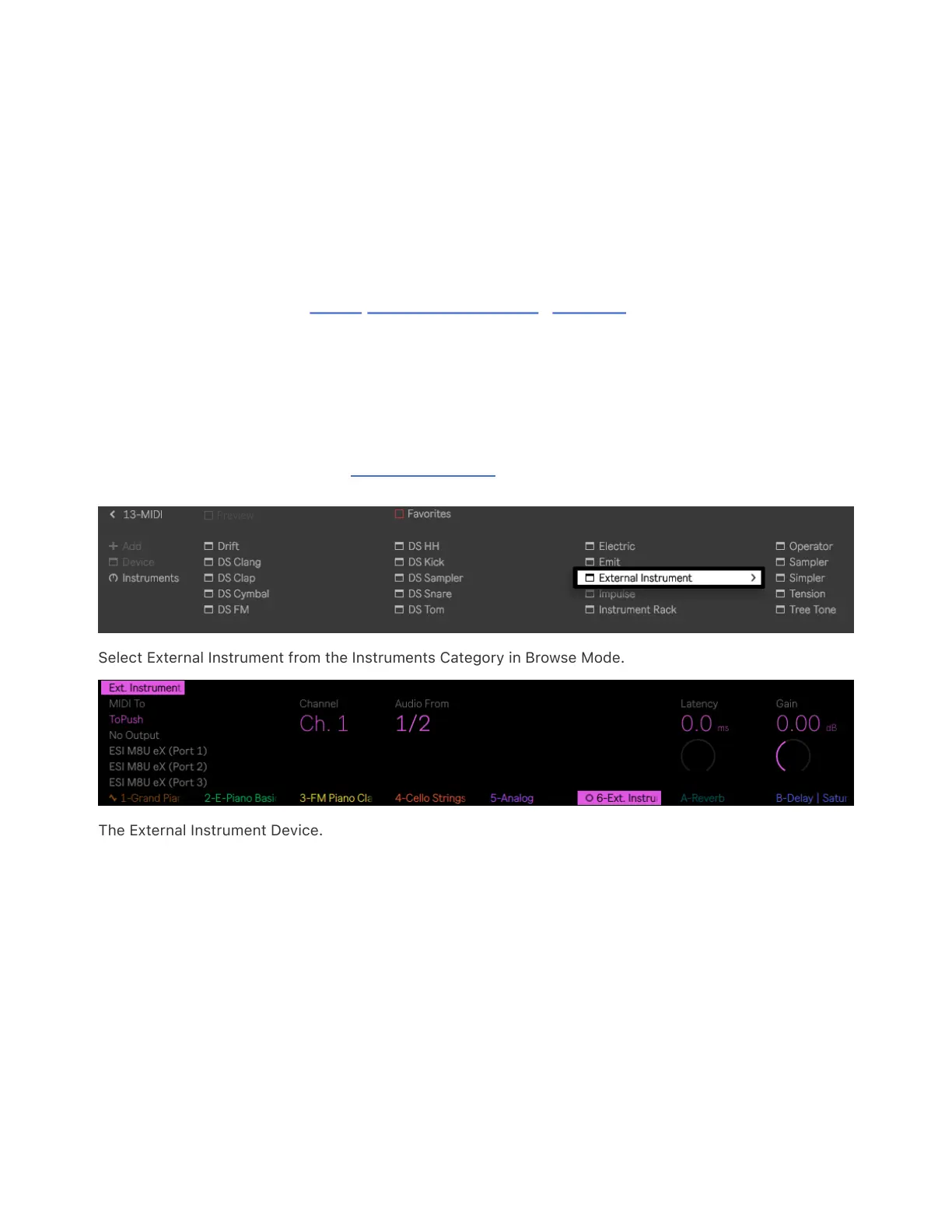 Select External Instrument from the Instruments Category in Browse Mode.