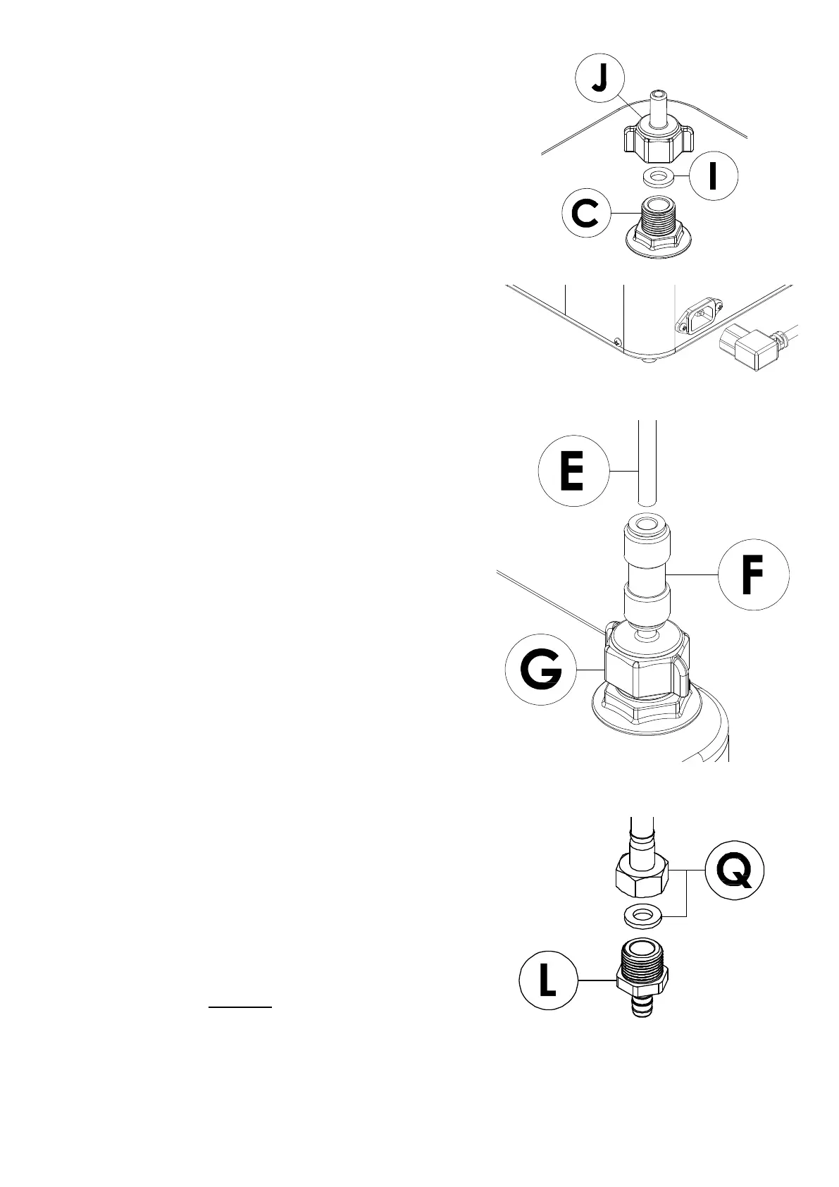 13. Push the ¼” blue flexible pipe (E) fully and firmly into the ¼” x