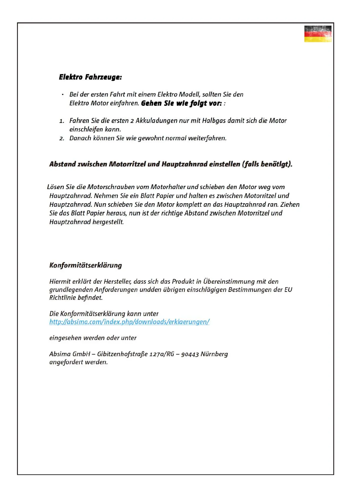 Absima ADB 1.4 - Elektro Fahrzeuge:; Abstand zwischen Motorritzel und Hauptzahnrad einstellen (falls benötigt).; Konformitätserklärung